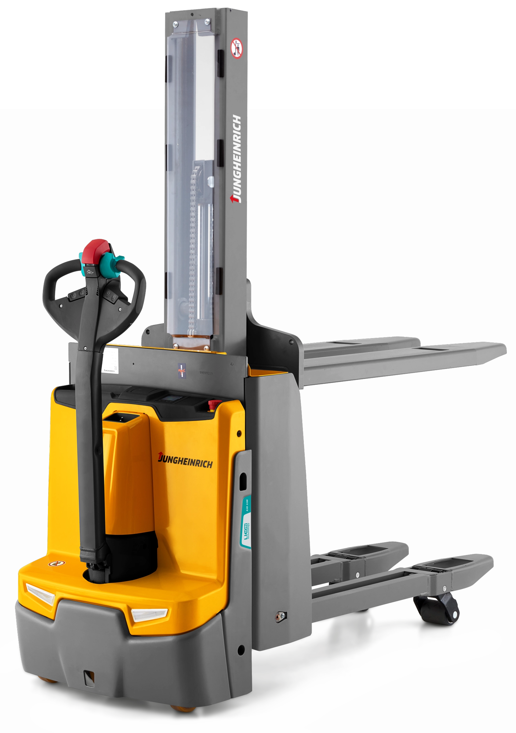 Low service weight and high manoeuvrability make our compact and versatile EJD 118i electric pedestrian stacker the perfect helper for space-saving use on HGVs or double-decker transport on ramps and uneven floors. The EJD 118i promises maximum efficiency with its future-proof lithium-ion battery with integrated charging technology for the utmost flexibility. The ProTracLink torsion bar ensures stable handling, while the standard proportional hydraulics guarantee controlled lifting and lowering. The truck's narrow mono mast ensures optimal all-round visibility at all times, for example when operating in shops with public traffic. Reflectors for better visibility as well as a long tiller with sufficient room between the truck and the operator to offer a high level of safety during every application.
