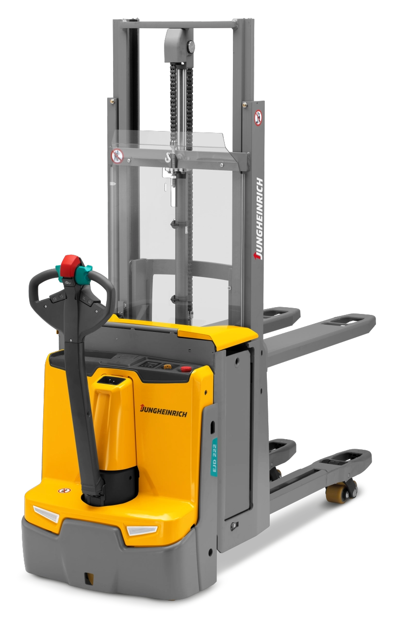 The versatile and compact EJD electric stacker truck is the perfect choice for the double-decker transport of goods on ramps and uneven floors, as well as stacking and retrieval at heights of up to 2,905 mm. This efficient truck combines stable handling with maximum manoeuvrability, even in confined warehouse conditions. By picking up two pallets at a time, the EJD works twice as fast as conventional trucks. Maximum occupational safety is ensured by intelligent assistance systems, a long safety tiller with 4-level foot protection, reflectors and optimum view of the fork tip. The modern 3-phase AC motor convinces with impressive endurance, high performance and optimum energy efficiency. A flexible choice of three travel programs and standard, sensitive proportional hydraulics for controlled lifting and lowering make comfortable working possible.