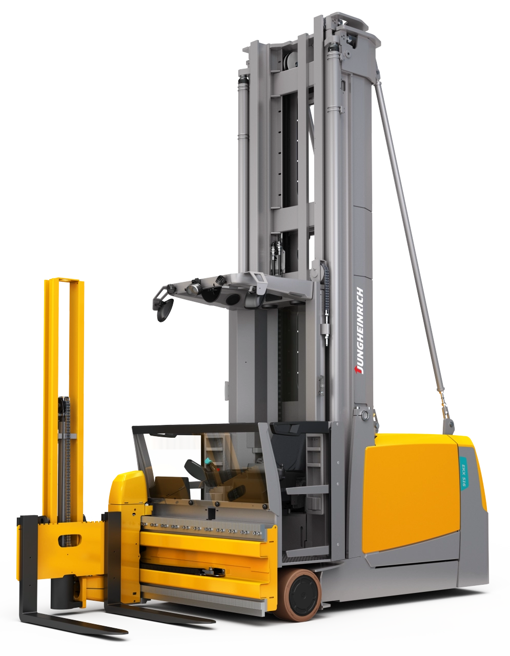 The powerful and efficient EKX series 4 and 5 tri-lateral stackers are our specialists for economical stacking and retrieval of entire pallets or picking individual articles in high bay warehouses. Whether middle lifting segment or lifting heights up to 18 meters - with our EKX you take your warehouse logistics to a new level. Intelligent lightweight construction and maintenance-free synchronous reluctance motors ensure first-class performance and outstanding efficiency. The driver and forklift work according to the man-up principle, where the driver's platform and forks are always at the same level. Patented vibration damping, RFID ground control and smart assistance systems guarantee optimal handling and maximum safety. Working while sitting or standing: On a generously dimensioned driver's seat with adjustable control panel, large storage areas and various equipment options - always ready to individually adapt to your warehouse requirements.