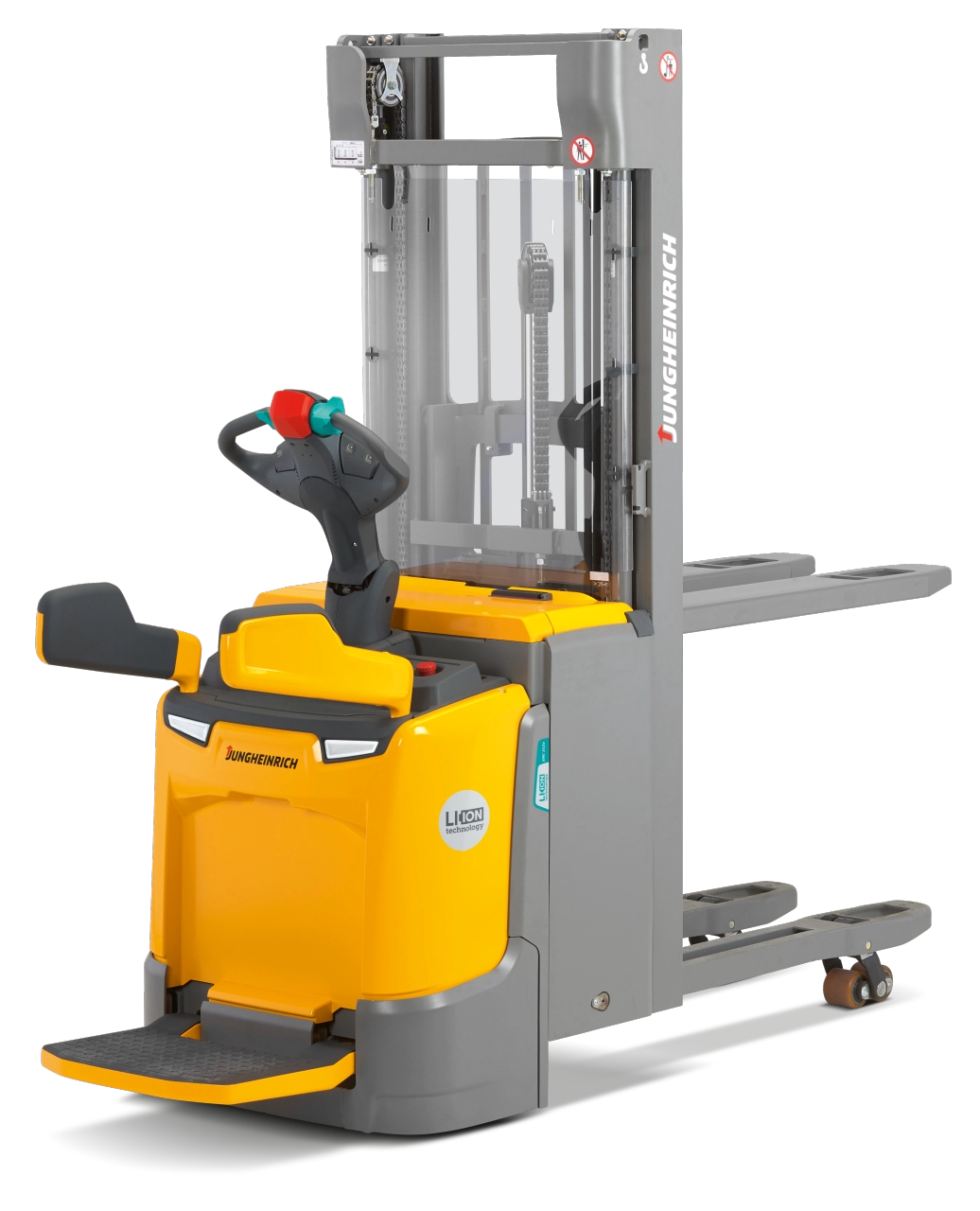 The efficient and versatile ERC electric pedestrian stacker trucks are particularly well suited for the economic transport of goods over longer distances as well as for stacking and retrieval operations at higher racking levels. Equipped with a folding stand-on platform or optional support arm lift, they can be used very flexibly over middle distances. Thanks to the increased ground clearance, uneven ground and ramps can also be negotiated without any problems. On request, the additional support arm lift enables the double-decker transport of two pallets at the same time for a significant acceleration of throughput. The strong and particularly precise lift motor allows for very gentle lifting and lowering of cargo at heights up to 6 metres. In addition, both the four-wheel concept and optional assistance systems such as the overload warning system operationCONTROL or the lifting height preselection positionCONTROL ensure more safety and efficiency in everyday warehouse operations.