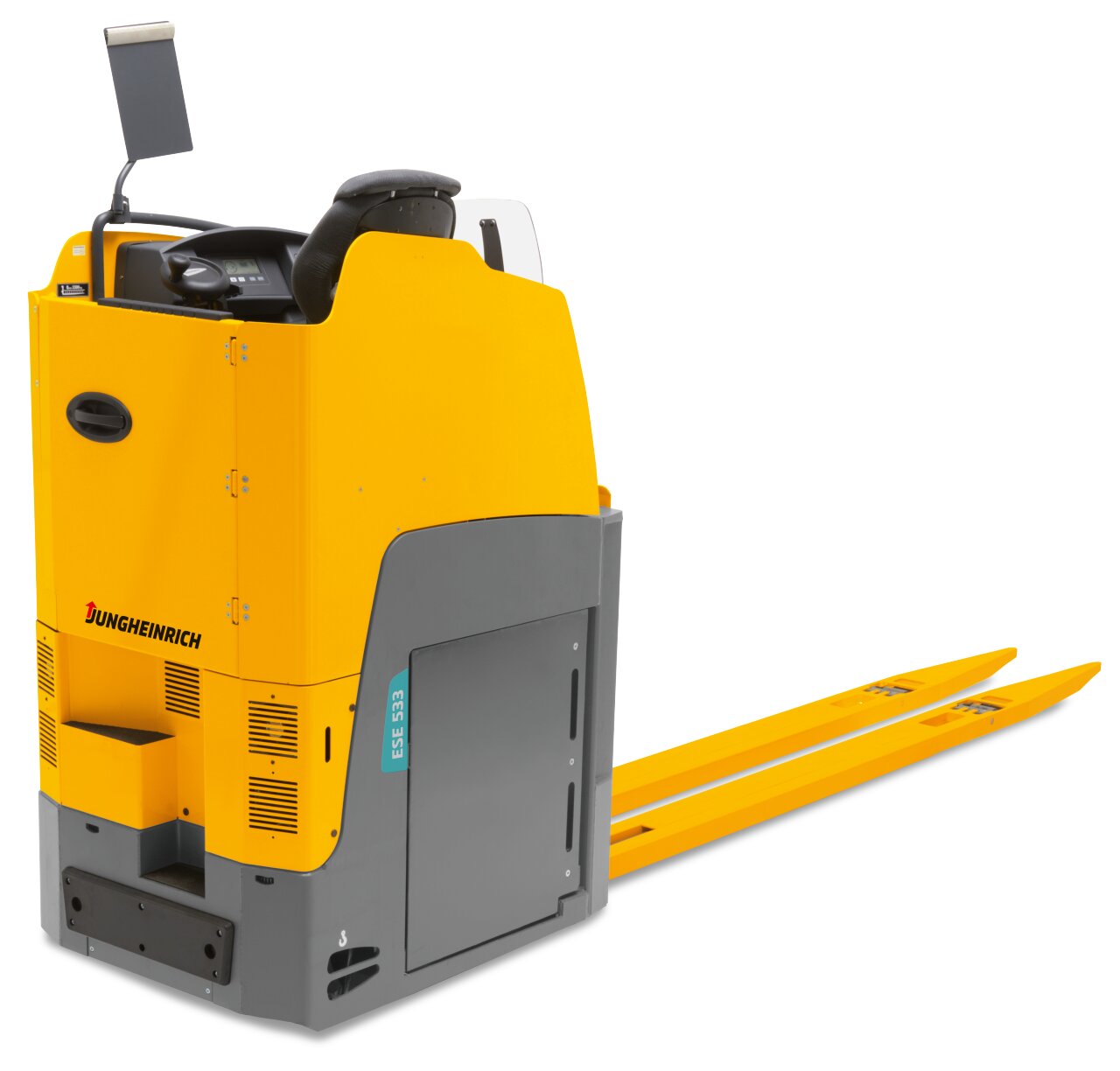 ESE 533 är en kraftfull och ergonomisk eldriven ledtruck med tvärställd stol. Perfekt för transport av tungt gods över långa sträckor. Trucken flyttar upp till tre lastpallar samtidigt och uppnår höga hastigheter även vid maximal belastning med de två reaktionssnabba drivmotorerna. Vårt fokus på ergonomi garanterar inte bara högsta komfort för föraren, utan bidrar även direkt till säkerheten. På så sätt kan körhastighet, broms och dödmansgrepp kontrolleras med pedaler som är lätta att nå. 360°-styrningen möjliggör enkla riktningsbyten och tack vare den tvärställda sittpositionen har truckföraren alltid full överblick. Kraftiga batterier och det enkla batteribytet från sidan garanterar att ESE 533 alltid är snabbt tillgänglig. Lång och intensiv drift är därmed inget problem.